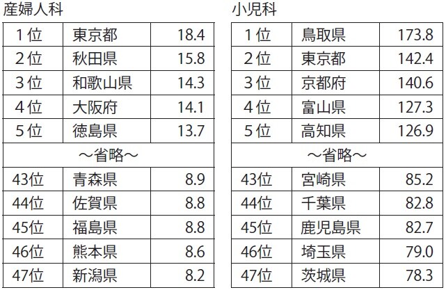 かつては診療科の中でも花形といわれた外科ですら、激務を敬遠する医師の増加によって、近年急激に減少しつつあるのです。また、産婦人科や小児科の医師数は地域によって偏りが大きく、厚生労働省が発表したデータによると、最も充実度の高い県と低い県の差は2倍以上であることが分かっています(図表)。