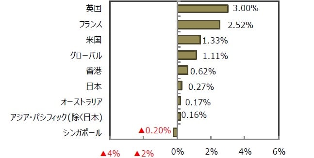 グローバル・リートは、英国の合意なきEU離脱の回避期待などから1.11%上昇しました。