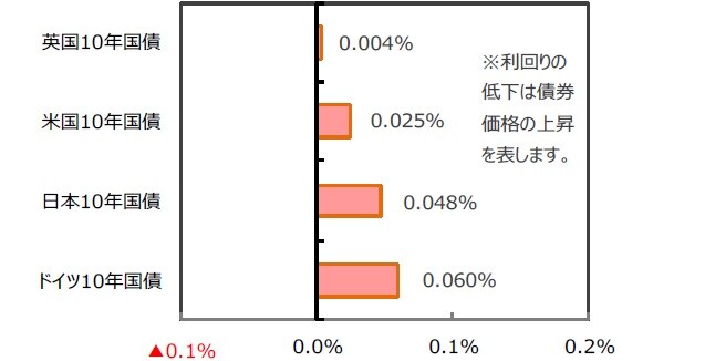 米国の10年国債利回りは、英国の合意なきEU離脱の回避期待などから0.025%上昇しました。日本、ドイツ、英国の10年国債利回りも上昇しました。