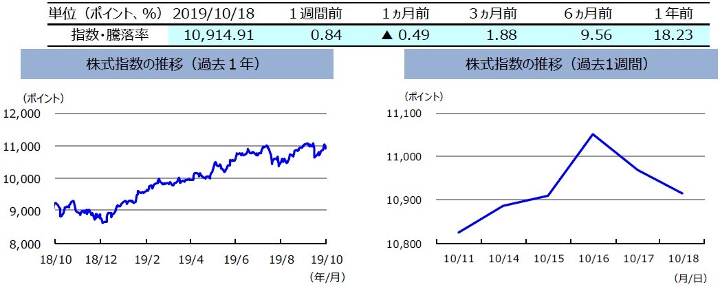 先週の豪州株式は、やや上昇しました。11日に米中閣僚級通商協議が一部合意に至り、進展が見られたことなどから投資家の懸念が後退し、豪州株式は上昇しました。但し週後半は、鉄鉱石価格が中国の需要懸念を背景に下落したことや、弱い中国経済指標などが嫌気され、資源・エネルギー関連銘柄を中心に下落しました。