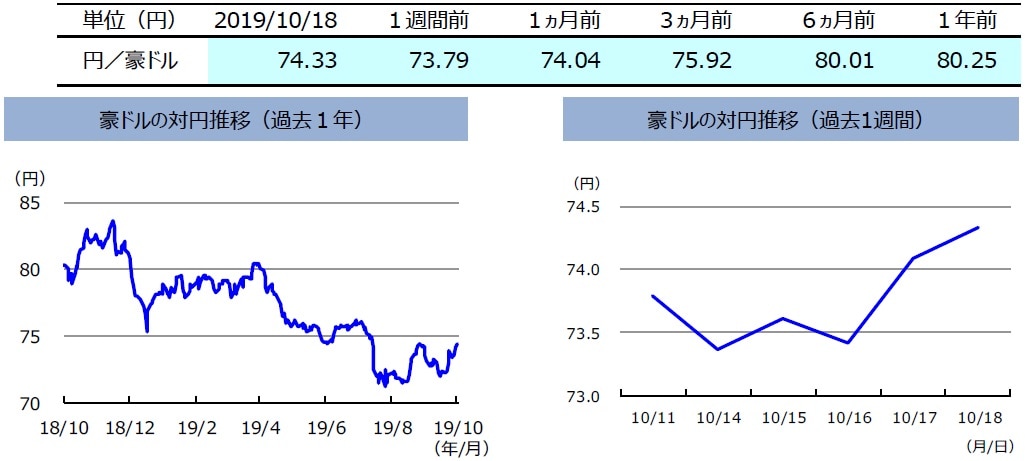 先週の豪ドルの対円レートは、上昇しました。週前半は、追加利下げ観測がくすぶる中、香港人権法案を巡り米中の対立が懸念されたことなどから豪ドルは軟調に推移しました。しかし、17日に発表された9月の豪雇用統計で、失業率が5.2%に低下し、雇用者数変化は予想を若干下回る増加幅だったものの正規雇用者数が増加したことなどを好感し上昇に転じました。