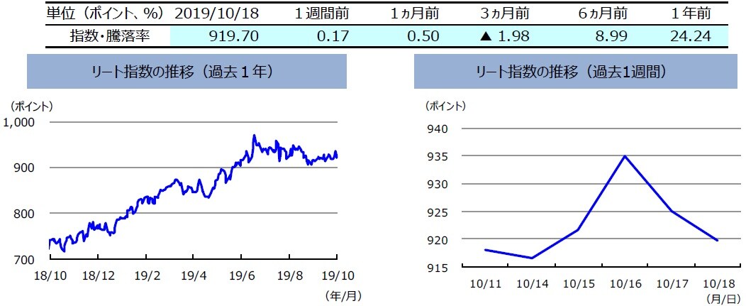 先週の豪州リート指数は、ほぼ横ばいとなりました。11日に米中閣僚級通商協議が一部合意に至り、進展が見られたことなどから投資家の懸念が後退し、豪州リートは上昇しました。週後半は、中央銀行のロウ総裁の発言を受けて金利が上昇したため、前週末の水準付近へ下落しました。
