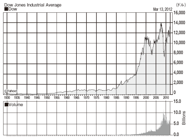 下記の図表1はアメリカの代表的な株価指数であるダウ平均株価(ダウ工業株30種平均)の推移です。ダウ平均株価自体は1896年に12銘柄で始まったものの、ここでは30銘柄に増えた1928年以降のみを掲載しました。