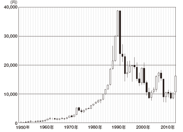 日経平均株価は、80年代後半のバブル(史上最高値3万8957円)と、その崩壊があったために、いささか変動幅が大きくなっていますが、それでもバブル発生前の80年代前半、つまり30年前から投資を続けていた人にとっては長期的には価格が上昇していることが分かります。