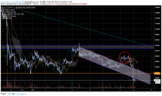 22日時点では90万円台までの約5万円幅のリバウンドを見せていたが、4h雲上限で上値の重さを確認すると三尊形成(赤丸)で下落。23日午前までに20日以降の上昇分を帳消しすると、23日夜にかけて一時80万円を割り込む急落を見せた。