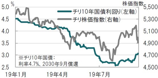 チリのデモが収束しないことを受け、チリ株式市場の下落や、国債利回り上昇(価格は下落)しています(図表1参照)。今回のデモのきっかけは地下鉄運賃の値上げと見られますが、値上げは既に撤回されており、市民の不満は現政権の政策に向けられていると見ています。チリでは11月にアジア太平洋経済協力会議(APEC)首脳会議も予定されているだけに、影響も懸念されます。