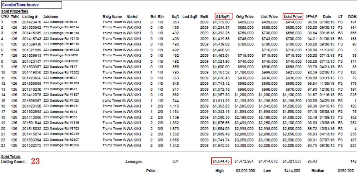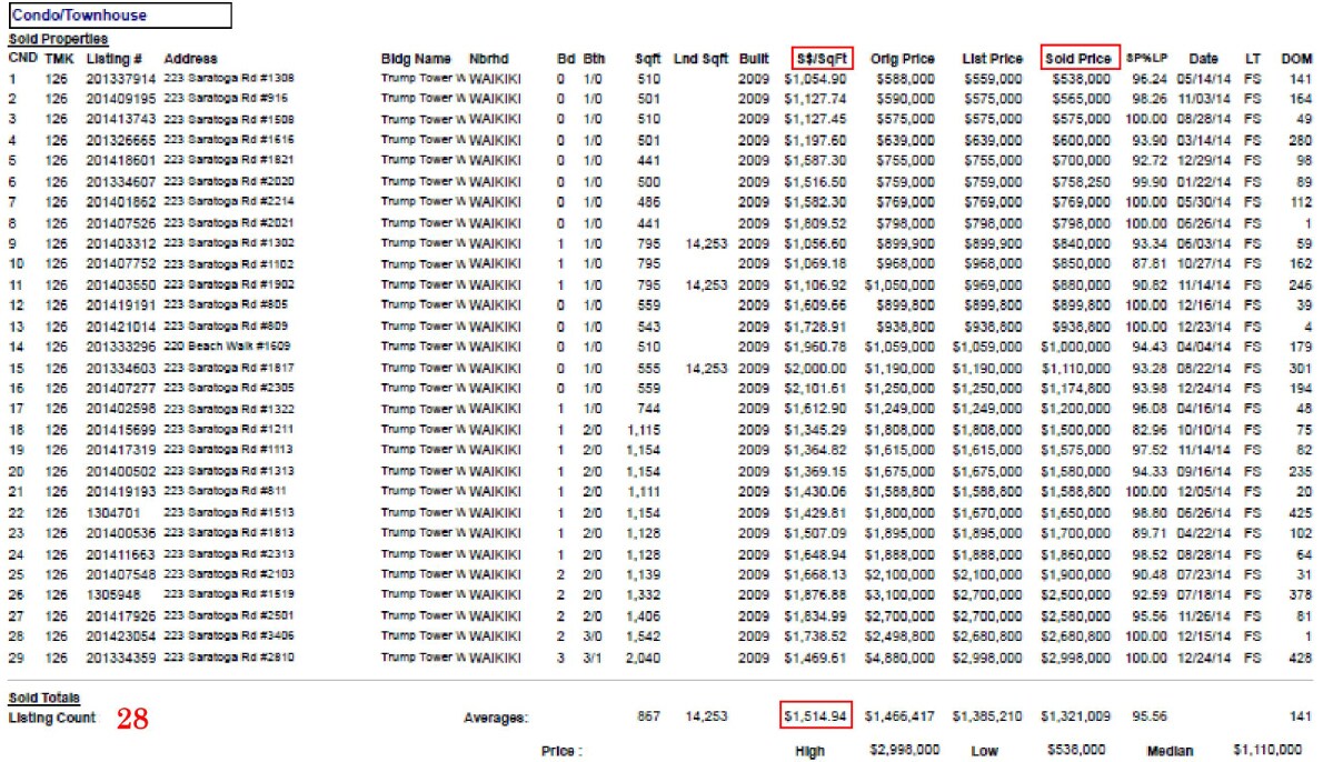 上記データは、不動産ライセンスの保有者が利用できる「MLS」という不動産情報サイトにて登録されている、2013年のTrump Waikikiの成約一覧になります。