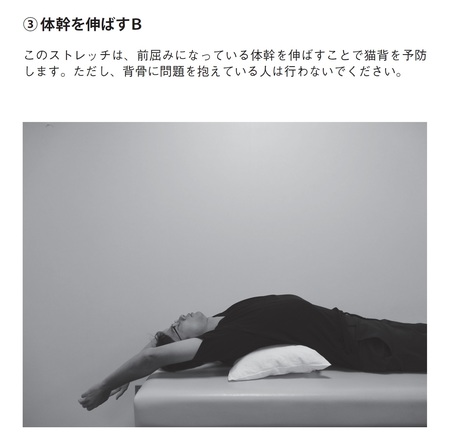 このように、人は痛みや外部環境の変化、ストレスなどから身を守るために本能的に体を丸め、猫背の姿勢をとる習性があるようです。したがって、意識して胸郭を広げる運動を取り入れることも大切です。