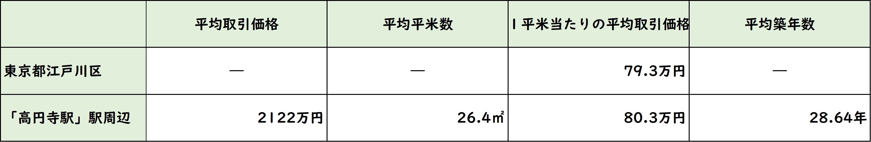 続いて直近の中古マンションの取引から、駅周辺の不動産マーケットの状況を見てみる(図表7)。平均取引価格は2,122万円。平均平米数は26.4㎡ということから、現在、高円寺地区では単身者向け物件の取引が盛んのようだ。