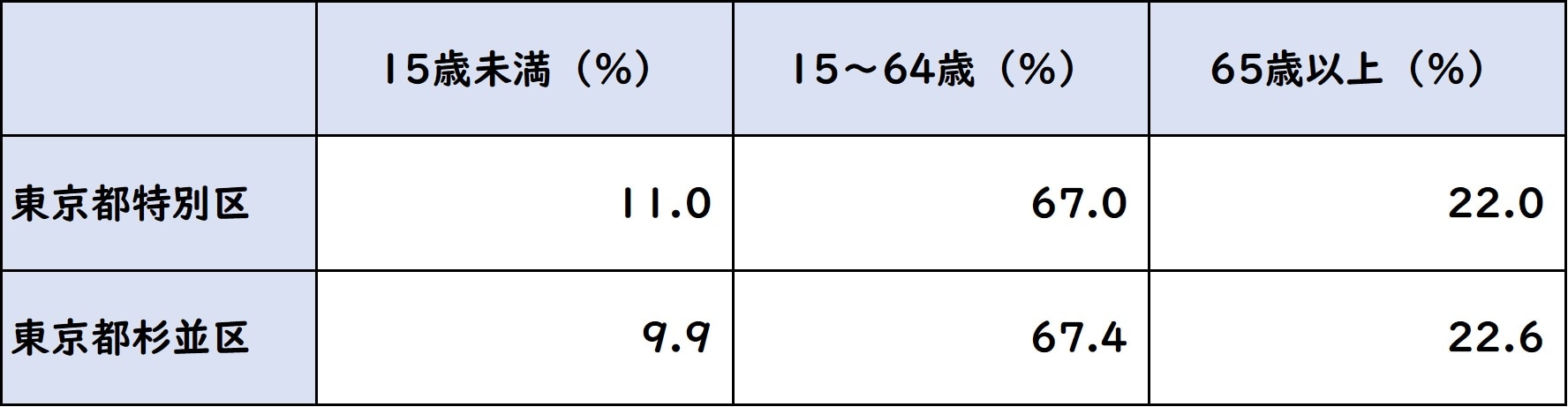 では「高円寺」を不動産投資の観点から見ていこう。まず直近の国勢調査(図表1)によると、杉並区の人口は約58万人。人口増加率は2.6%と23区平均を下回るものの、安定的な人口増加を示している。年齢構成(図表2)を見てみると、15歳未満の人口が23区平均を下回っているものの、ほぼ23区平均に近しい人口構造だといっていいだろう。