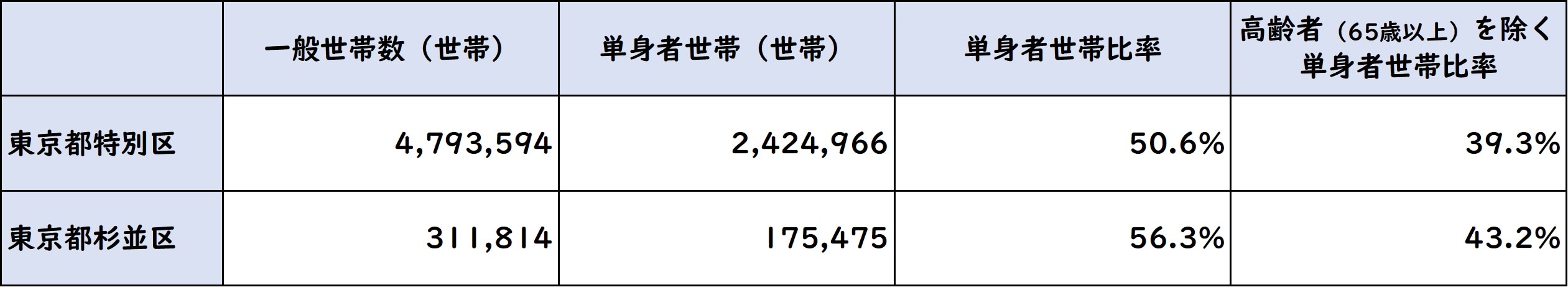 一方世帯数(図表3)を見てみると、杉並区の単身者世帯率は56.3%、高齢者を除くと43.2%と、いずれも23区平均を上回る。都内でも現役世代の単身者に支持されているエリアだということが明らかだ。