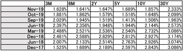 利回り曲線も、2年から5年の中期債利回りが、1年未満の短期金利を大きく下回るまで低下する「逆イールド状態」が続いてきたが[図表1]、10月末のFRBによる3度目の金融緩和以降、利回りは中期債・長期債ともに、上昇に転じ、イールドカーブもほぼフラット(平ら)な形状に回帰している[図表2]。
