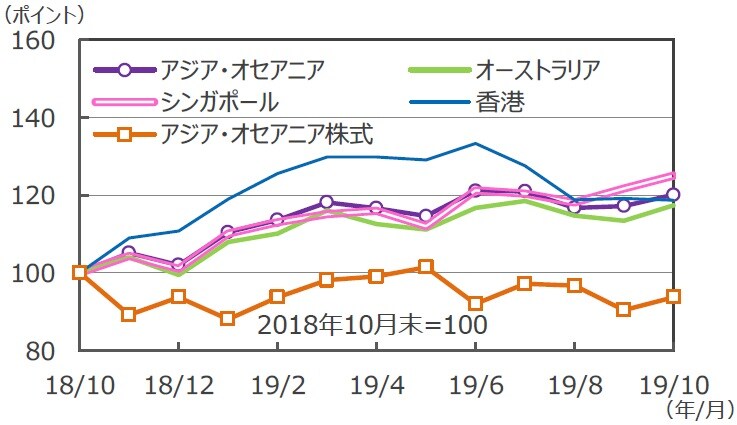 ■10月末時点のアジア・オセアニアのリート市場は、現地通貨ベースでオーストラリアが前月比+1.3%、シンガポールが同+1.1%と上昇しました。一方、香港は▲0.4%と下落しました。デモの長期化による混乱の不動産市場への影響が懸念され、続落しました。