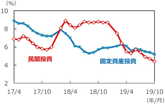 ■固定資産投資の内訳をみると、約6割を占める民間投資が同+4.4%と、1~9月(同+4.7%)から更に鈍化しました。米中貿易摩擦の影響で引き続き民間企業の投資が抑制されています。インフラ投資も同+4.2%と、1~9月(同+4.5%)から鈍化しました。
