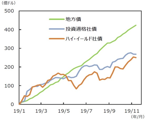 ■債券ファンドは、「先進国」が+492億ドル(同+304億ドル)と10カ月連続の流入超です。中心は「米国」で+323億ドル(同+223億ドル)です。国債や地方債に投資するファンドが中心ですが、投資適格社債やハイ・イールド社債に投資するファンドも流入超の傾向が続いています。