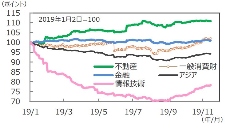 ■グローバル景気の回復に対する期待が高まる中、アジアでも「情報技術」の業績、株価が堅調に推移するなど、プラスの影響が確認されます。株価上昇のための下地は整いつつあると思われ、今後は、米中の部分合意の妥結、香港デモの収束などによって、センチメントの改善を待つ必要がありそうです。