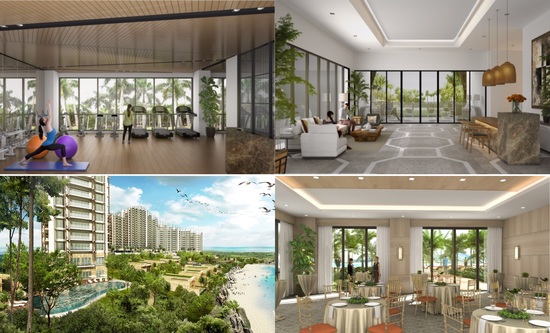 ARUGAの完成予想図を、海側から見てみましょう。注目は300mのプライベートビーチ。周辺のホテルと比較すると、シャングリ・ラが190m、シェラトンが130m、モーベンピックが65m、クリムゾンが93mと、ARUGAのプライベートビーチは圧倒的な長さを誇ります。