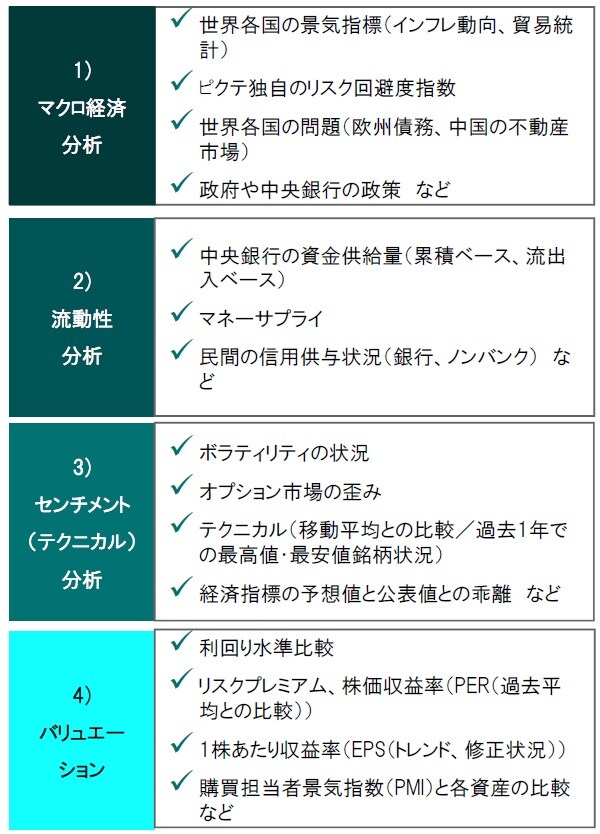 ピクテでは資産配分比率決定の分析ポイントとして4つの柱を用いています。その4つの柱は、1)マクロ経済分析、2)流動性分析、3)センチメント(テクニカル)分析、4)バリュエーションです。たとえば、株式の投資配分を決定するにあたってもすべての要素が常に株式のオーバーウェイトを同時に示すわけではありません。投資判断決定には、こうした異なる観点からの投資判断決定のポイントを勘案することが重要と考えています。