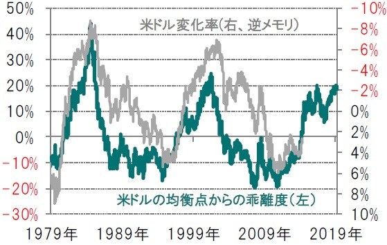※米ドルの均衡点からの乖離度は、貿易加重レートの過去のトレンドからの偏り