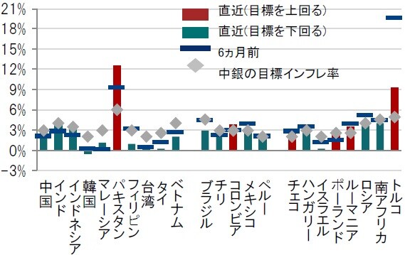主な新興国のインフレ率は、過去の大幅な通貨安に苦しむトルコのような極端なケースを除けば、多くの国で半年前に比べインフレ率は低下しています。