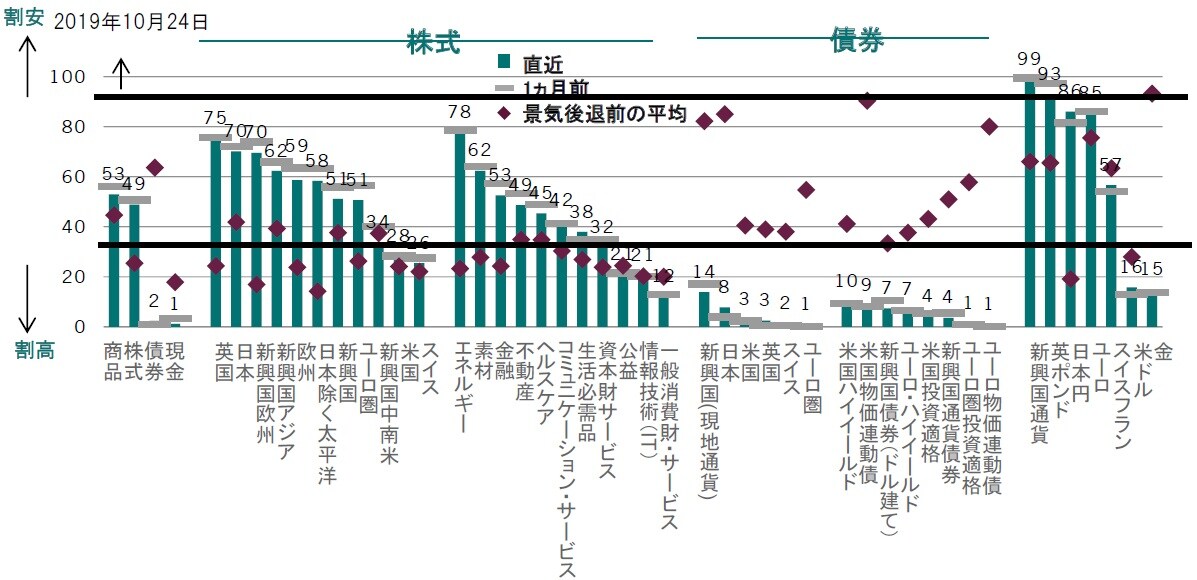 ※景気後退前の平均:2000年と2007年の平均値各資産のバリュエーション、過去平均(20年)から見た水準:過去20年で何%の水準にあるかを表示