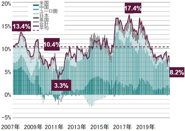 中国は、これまでのところ各国の金融緩和に追随していません。公式な政策として「影の銀行(シャドーバンク)」の債務圧縮を続けていることに加え、アフリカ豚コレラの蔓延に起因してインフレ率が上昇し、中央銀行の政策余地が限られているからです。もっとも、米中協議の結果が状況を若干改善する可能性は残るかもしれません。世界の主要中央銀行のバランスシートの伸び率はマイナスであるにもかかわらず、商業銀行の貸出伸び率は依然として堅調です。この傾向は2018年以降から変わっていません。