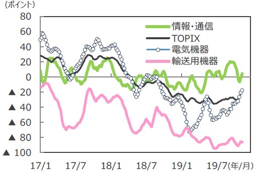 ■ただ、日本株式市場は企業業績の底打ちや米中の対立を巡る過度な懸念の後退を一旦織り込んでおり、次第に上値は重くなる可能性があります。もう一段の株価上昇には、世界経済と業績の回復に対する確信度の高まりが必要と考えられます。例えば、今底値圏にある「輸送用機器」のリビジョン・インデックスが上向き始めれば、1つのシグナルになるかもしれません。
