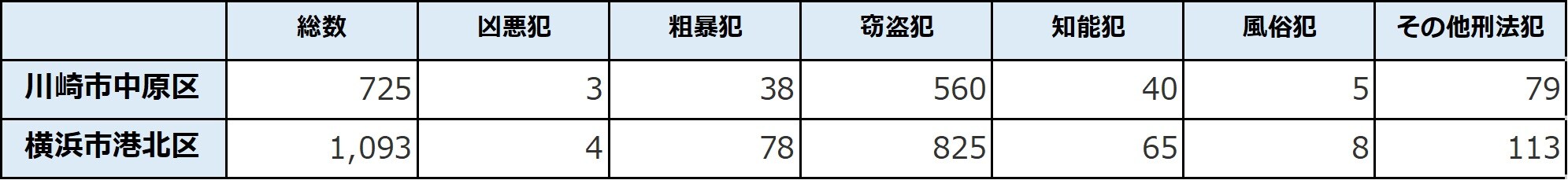 殺人罪などを含む「凶悪犯」、傷害罪や暴行罪などを含む「粗暴犯」、詐欺罪などを含む「知能犯」のほか、「窃盗犯」「風俗犯」などの合計が、中原区は725件、港北区が1093件となっている。