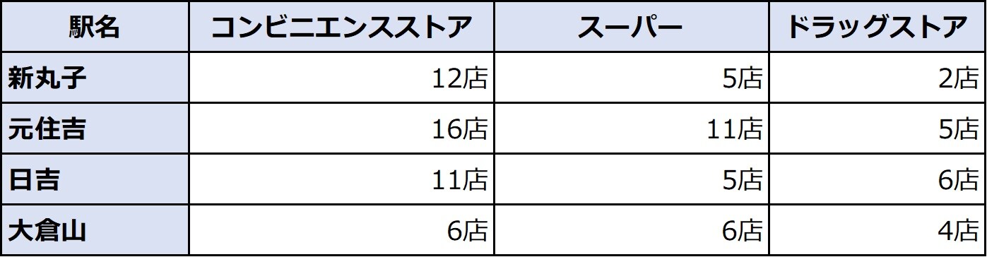次に生活利便性を見ていこう。駅から10分以内にある①コンビニエンスストア ②スーパー ③ドラッグストア の数をカウントした(図表2)。