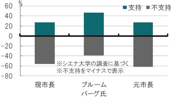 ブルームバーグ氏は金融ベンダーの実業家として大成功を収めました。その上、NY市長を3期務めています。市長としての評価は現職、元市長(ブルームバーグ氏の前任)を上回るという調査もあるなど人気を保っています(図表1参照)。ただ、今回の出馬表明もギリギリまで様子見をしています。政党も当初民主党から、共和党に、その後無所属で再び民主党と変えています。この経緯は大統領候補となると、攻撃の材料となるかもしれません。