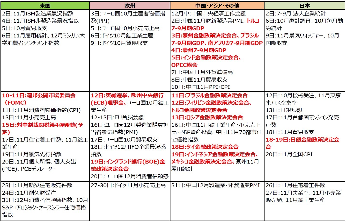 ■米中協議は、10月の閣僚級協議で部分合意に達したと報じられた後も、内容についての交渉が続いています。12月15日発動予定の米国の対中制裁関税引き上げが市場の期待通り見送られるか注目されます。
