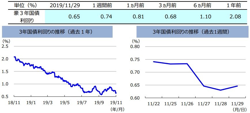 先週の豪州の3年国債利回りは、低下しました。RBAによる追加緩和観測が強まり、豪3年国債利回りは低下しました。また、トランプ大統領の署名により、「香港人権・民主主義法」が成立したことで米中協議への影響が懸念されたことや、豪州の第3四半期民間設備投資が前期比0.2%減少するなど、さえない経済指標も債券利回りの低下要因となりました。