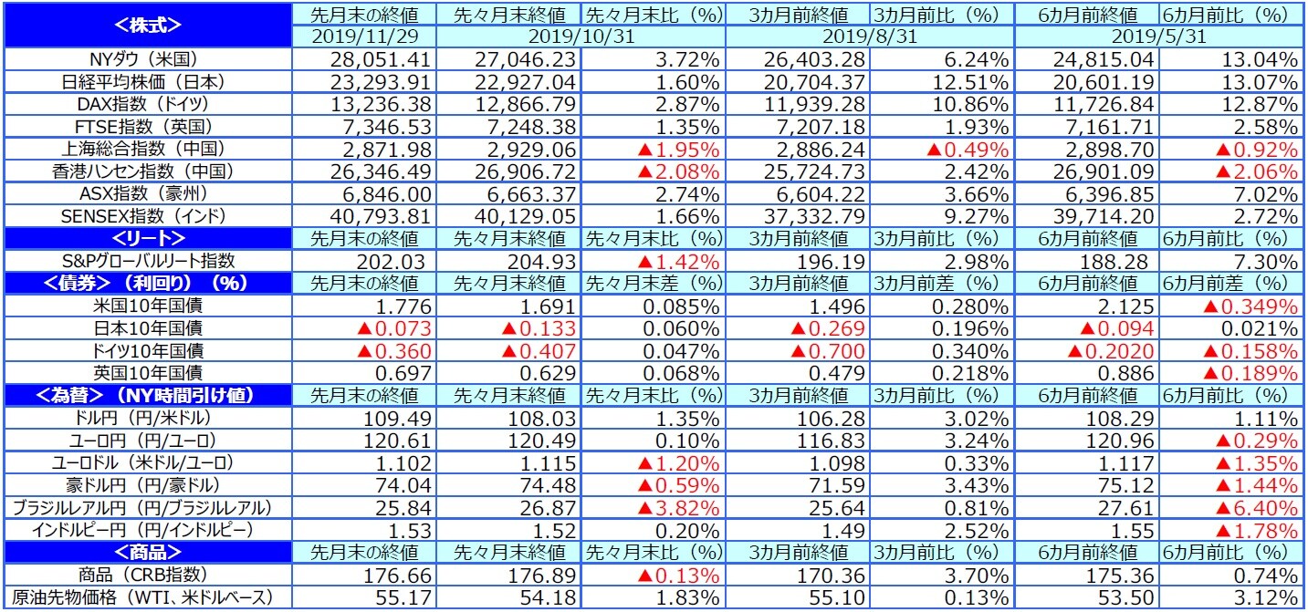 米国の株式市場は、米中協議の進展期待や米国の好調な経済指標などを背景に上昇しました。主要3指標がそろって史上最高値を更新しました。日本の株式市場は、米中協議の進展期待に加え、円安が進行したことが好感されて上昇しました。欧州の株式市場も、米中協議の進展期待を背景に上昇しました。一方、中国や香港の株式市場は中国経済の減速懸念や長期化する香港デモと米国で「香港人権・民主主義法」が成立したことによる米中協議への影響などが懸念され、下落しました。