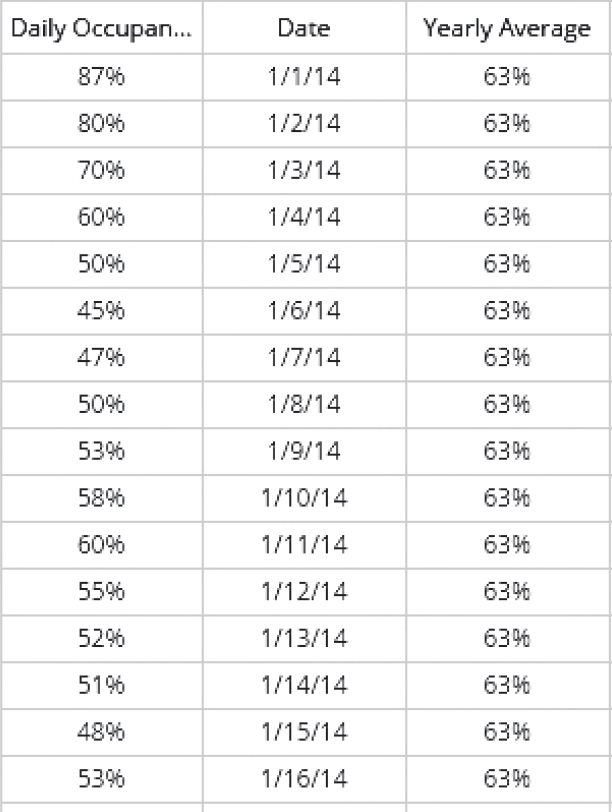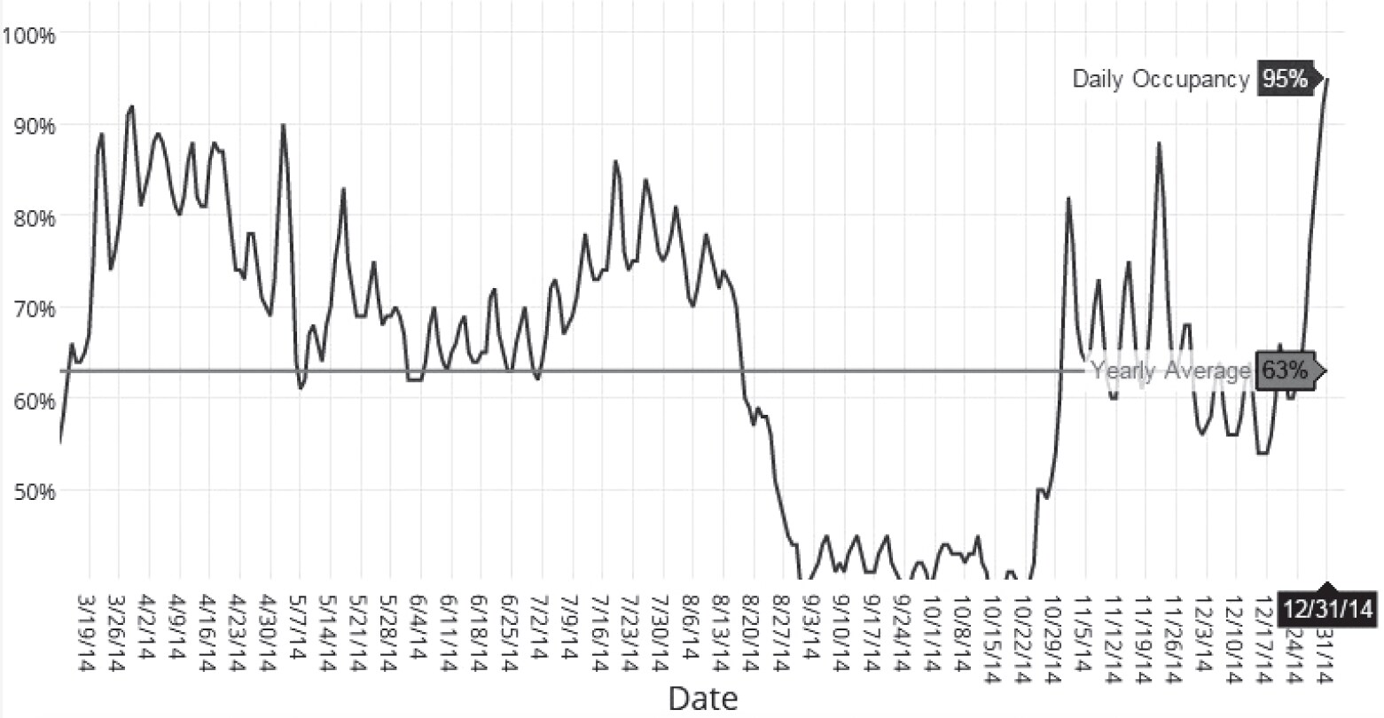 10月後半からグラフは回復していき平均を上回りますが、11月中旬にはまた平均を下回ってきます。次に平均よりも上がってくるのは、12月のクリスマス以降の年末年始です。1年で最も高い値は、12月31日の95%です。1月1日も87%と高く、年末年始は非常に高水準の稼働率で推移していきます。