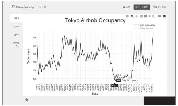 ただし、2月で唯一平均を上回る日があります。それが2月20日か23日です。ここは旧正月です。中華系の人たちが新年を祝って日本に押し寄せるので、ここはグラフが上がります。しかし全体的に言えば、冬の時期1~3月中旬までは、Airbnbのオフシーズンということになります。