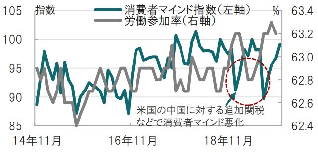 労働参加率は前月から小幅低下しましたが、中長期的な上昇傾向を維持する水準(63.2%)を維持しました(図表2参照)。同日に公表されたミシガン大学消費者マインド指数の12月速報値も改善しました。消費者マインド指数は短期的には米中関係の悪化などにより低下も見られますが、雇用市場の広がり(改善)は消費の下支え要因と見られます。