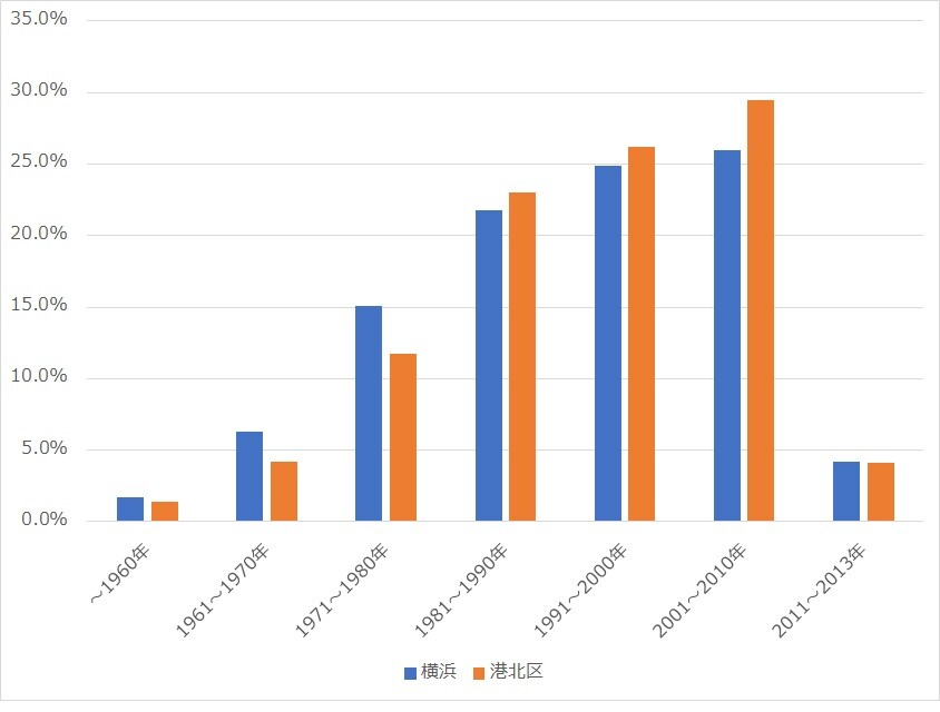 次に住宅事情を見てみよう。港北区の賃貸住宅における空室率(図表4)は7.3%と、横浜市全体を上回る。賃貸住宅の建設年の分布(図表5)をみてみると、港北区では横浜市平均と比べて、2000年以降の割合が多い。これは、横浜市営地下鉄4号線「日吉」~「中山」が2008年に開業するなどして、交通利便性の低かった港北区内で宅地化が進み、マンション等が増加したことによるものと推測される。また空室率の高まりは、近年賃貸物件が増加したことによるものと考えられる。