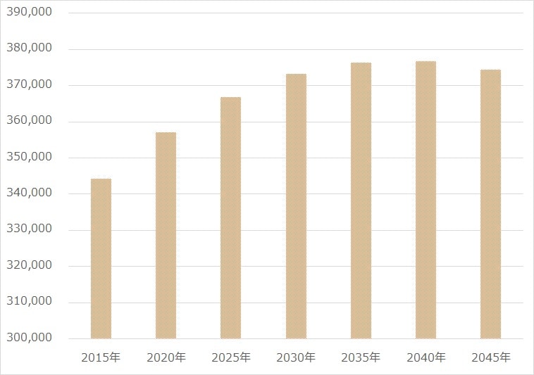 港北区の将来人口の推計を見ていこう。国立社会保障・人口問題研究所の推測(図表8)では、港北区は横浜市のなかでも人口増加が続くエリアで、2040年376,636人をピークに、人口減少が始まると推測されている。2015年を100とすると、2040年は109.4という水準なので、将来的にも有力な投資先候補になるだろう。