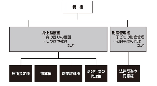 親権には、「身上監護権(居所指定権、懲戒権、職業許可権など)」と「財産管理権」が含まれます。このうち、親が子どもを監護し教育する権利・義務である「身上監護権」のことを個別に「監護権」と呼んでいます。