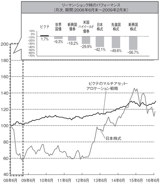 影響は株式だけに留まりませんでした。米国ハイイールド債マイナス29.9%、新興国債券マイナス18.2%、世界国債マイナス9.3%と、債券も同時に大きく下落。そうした中、リスク・バジェッティングの考え方で徹底的な分散投資を行ったピクテ・グループの「ピクテ・マルチアセット・アロケーション戦略」は、同じ時期にプラス1.7%という収益を上げていました。