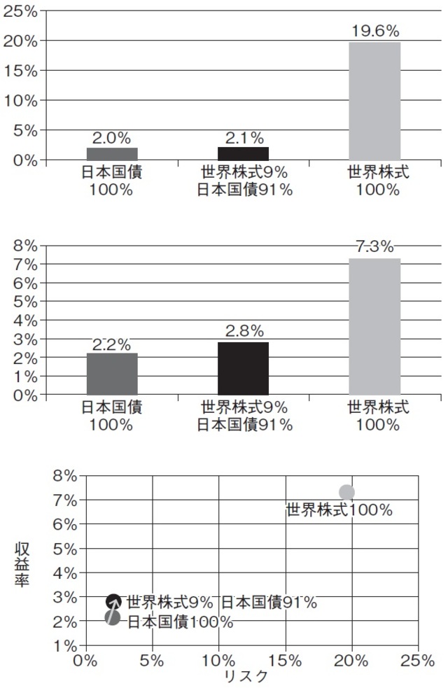 世界株式が約20%に対し、日本国債は2%です。世界株式のほうが日本国債よりも10倍程度リスクが高く、つまり、これは世界株式のほうが10倍近く変動するということを意味します。このため単純に50%ずつ保有すると、その組み合わせた資産の価格変動は、世界株式の変動に大きく影響を受けることになります。ではそんな条件下で、うまくバランスさせるにはどうすればいいのでしょうか? 世界株式の変動を日本国債の変動で中和するには、リスクの低い日本国債を世界株式よりも10倍多く保有すればいいのです。つまり、配分比率では世界株式9%と日本国債91%の配分がちょうどいい水準と言えます。この配分で保有した場合のリスク量は日本国債とほぼ同じで、パフォーマンスは年率0.6%引き上げることができています(図表3)。