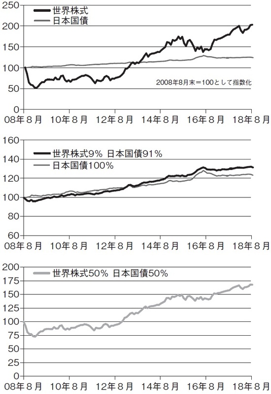 ※世界株式:MSCI世界株価指数(円換算)、日本国債:FTSE日本国債指数、世界株式と日本国債のバランス運用は月次リバランス
