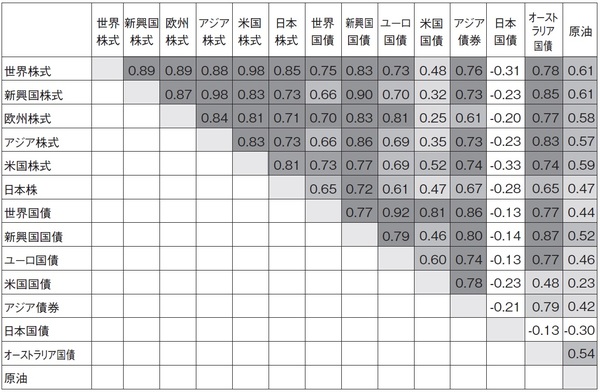 ※世界株式:MSCI世界株価指数、新興国株式:MSCI新興国株価指数、欧州株式:MSCI欧州株価指数、アジア株式:MSCI新興国アジア株価指数、米国株式:S&P500種株価指数、日本株式:TOPIX、世界国債:FTSE世界国債指数、新興国国債:JPモルガンGBI-EMグローバル・ディバーシファイド指数、ユーロ国債:FTSEEMU国債指数、米国国債:FTSE米国国債指数、アジア債券:JPモルガンEMBIグローバル・ディバーシファイド・アジア指数、日本国債:FTSE日本国債指数、オーストラリア国債:FTSEオーストラリア国債指数、原油:NYMEX軽質スイート原油先物、すべてトータルリターン、円換算