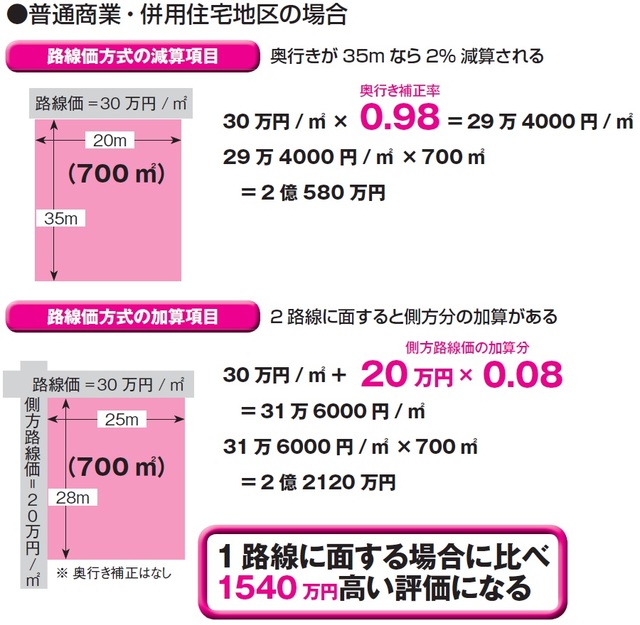 ●路線価方式では、土地の形状や位置によって減算、加算されることがある。