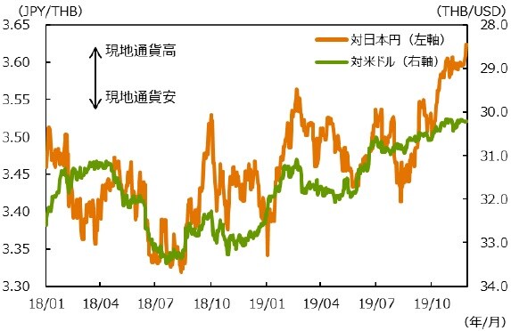 11月のタイバーツ対米ドルレートは30.1~30.4の狭いレンジで高止まった。バーツ高の背景には、経常収支黒字とインフレ率の低位安定に対する高い評価がある。中国からタイへの生産ライン移管など中長期的な動きも踏まえると、バーツ高圧力が続きそうだ。また、輸出企業にマイナスとなるバーツ高の抑制を意図して中銀が利下げに踏み切ったことから、市場参加者の中には中銀に一段の利下げを促すためにバーツを買い進む動きも出ているようだ。