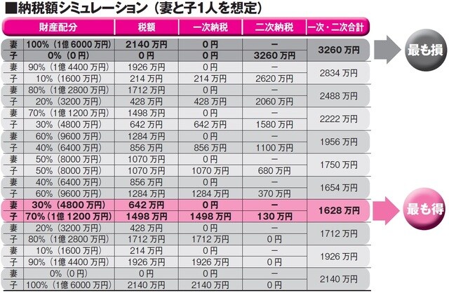 配偶者の税額軽減の特例を利用することで納税額を減らす節税です。配偶者には財産の半分、あるいは1億6000万円までは無税とする特例があり、配偶者の取得割合を増やすことで納税額を減らすことができます。しかし、配偶者が相続した財産は次の相続でまた課税対象となり、最初は納税額が少なくても次の納税額が多くなることもあります。よって一次、二次の分け方によるトータルの相続税額を計算し、納税額が少なくなる分け方を比較して選択するようにします。