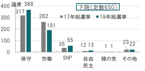 現地メディアの出口調査によると、保守党は368議席、労働党は191議席、自由民主党13議席、スコットランド民族党(SNP)55議席、緑の党(1議席)と予想されています(図表1参照)。なお、ブレグジット党はゼロが予想されています。保守党の出口予想は、直前の世論調査(339議席程度)を大幅に上回る結果が見込まれています。