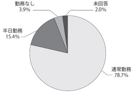 さらに、ほとんどの勤務医は一晩中診療に当たった後に、そのまま続けて通常と同じ日勤をこなさなければなりません。当直明けに休める勤務医は3.9%しかおらず、15.4%が半日勤務、78.7%の医師は通常どおりに勤務していることが分かっています(図表3)。