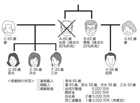 社長Aには妻Cとの間に3人の子ども(長女D、次女E、三女F)がいますが、C、D、E、Fは社業には全く携わっていません。専務Bの長男HがX社の営業課長として働いており、実績や人望もあることから、後継者として自他共に認める存在となっていました。