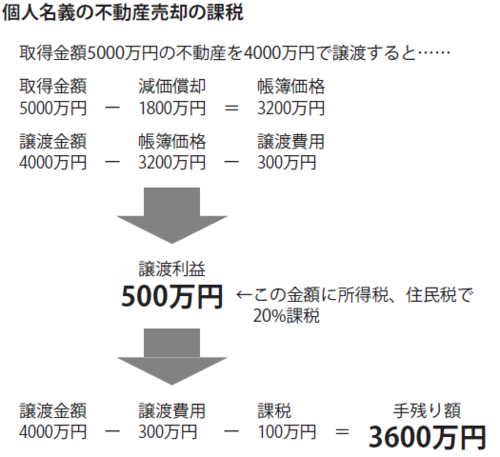 例えば、取得価格5000万円の建物を、4000万円で譲渡した場合、売却時の帳簿価格は取得価格5000万円から減価償却分1800万円を引いた3200万円です。譲渡価格4000万円から3200万円と譲渡費用300万円を差し引くと、譲渡による利益は500万円です。クリニックの建物を売却以前に5年以上保有していれば、これに対して所得税と住民税が20%の税率で課せられます。手元に残る金額は3600万円となります。